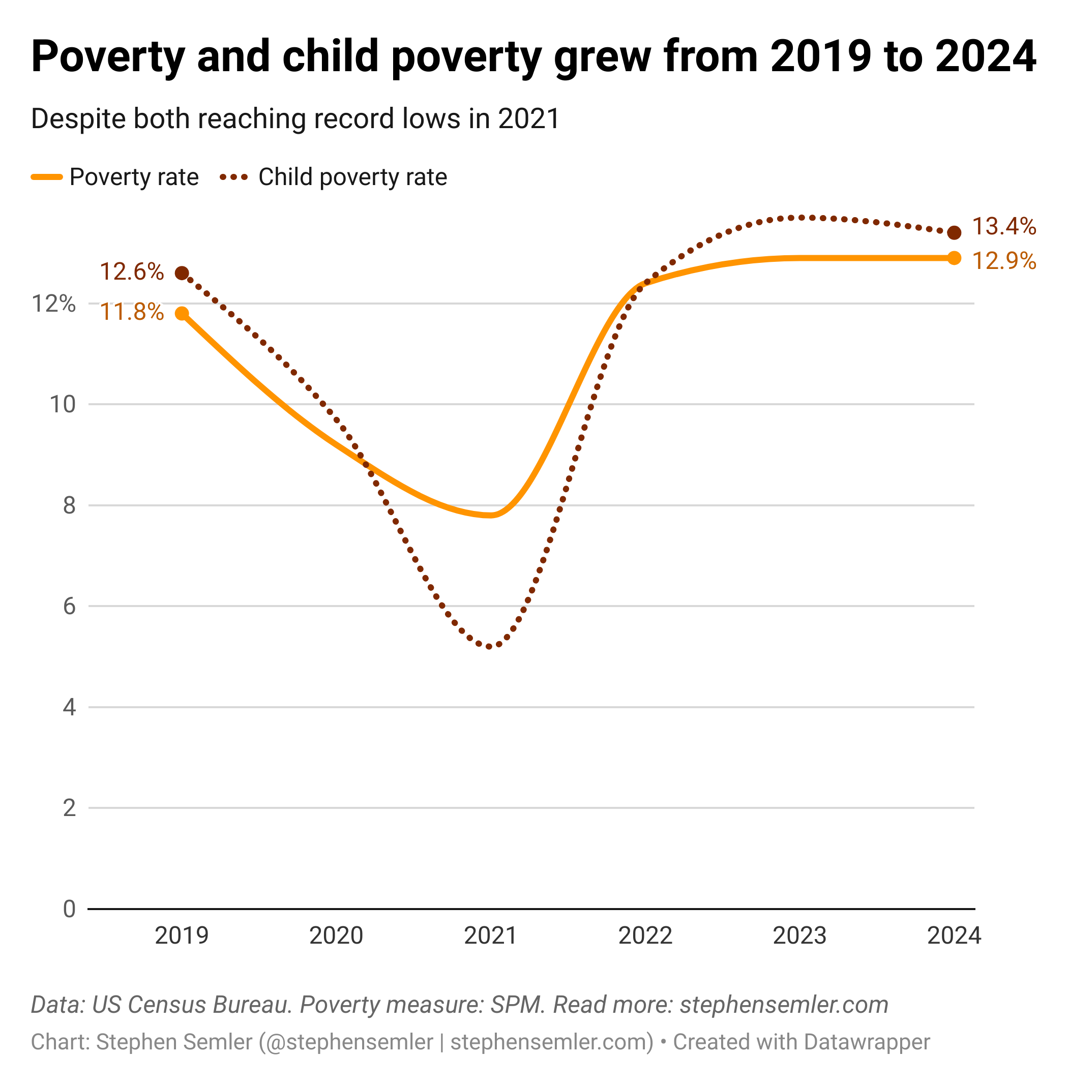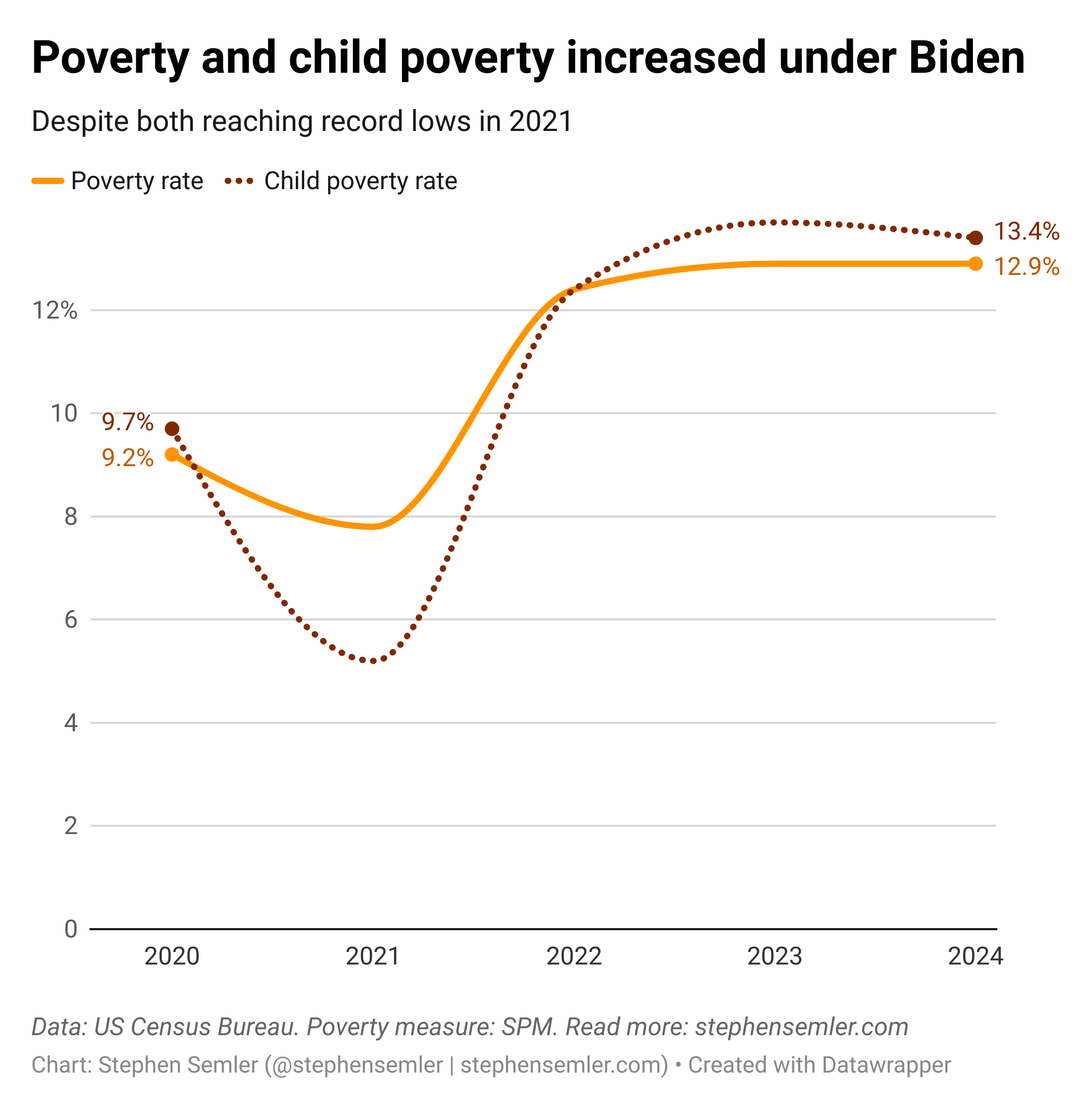 I’ve included a chart for each data range below. Why the second one looks so much worse: There was a historic drop in poverty during the final year of Donald Trump’s first term. This was because in 2020, the US government spent money on public health and social welfare like it typically only does for wars: massive new investments enacted quickly, without the endless debates on how to pay for them (no US war since Vietnam has been paid for by a corresponding tax increase; they’ve all been funded through the deficit). This included $1.7 trillion through the CARES Act (enacted March 2020) and $868 billion through the Consolidated Appropriations Act (enacted December 2020).
