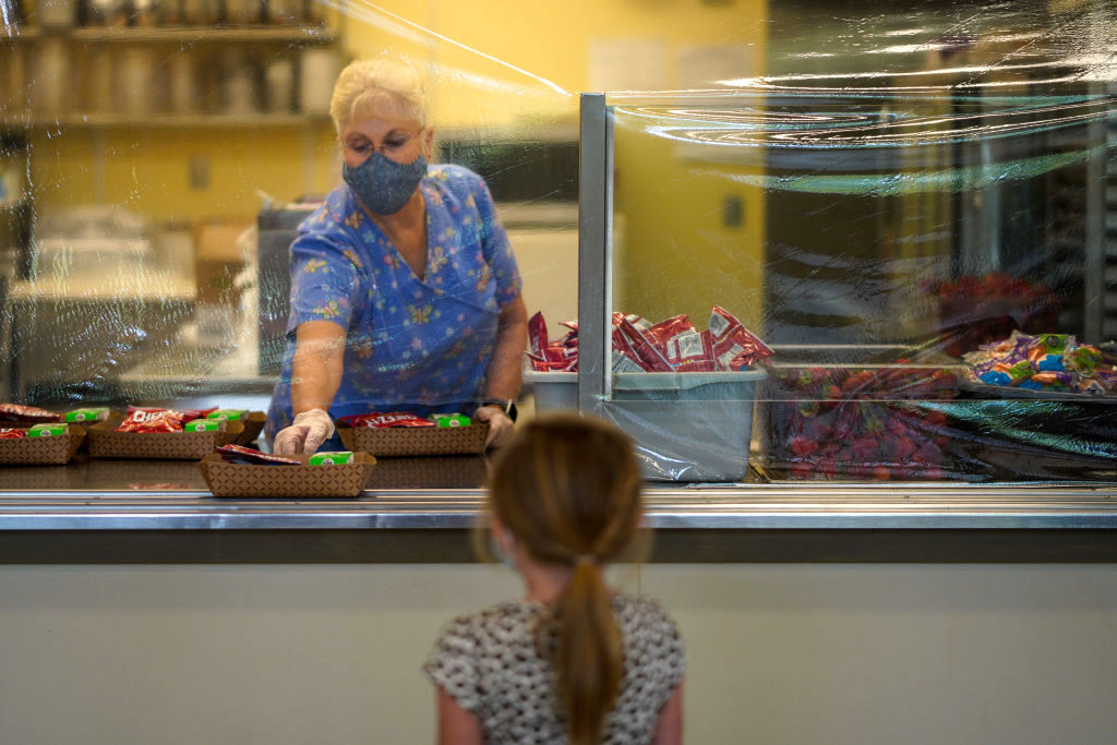 A cafeteria worker passes out lunches at Weaverville Elementary, California, 2020. (Kent Nishimura / Los Angeles Times via Getty Images)