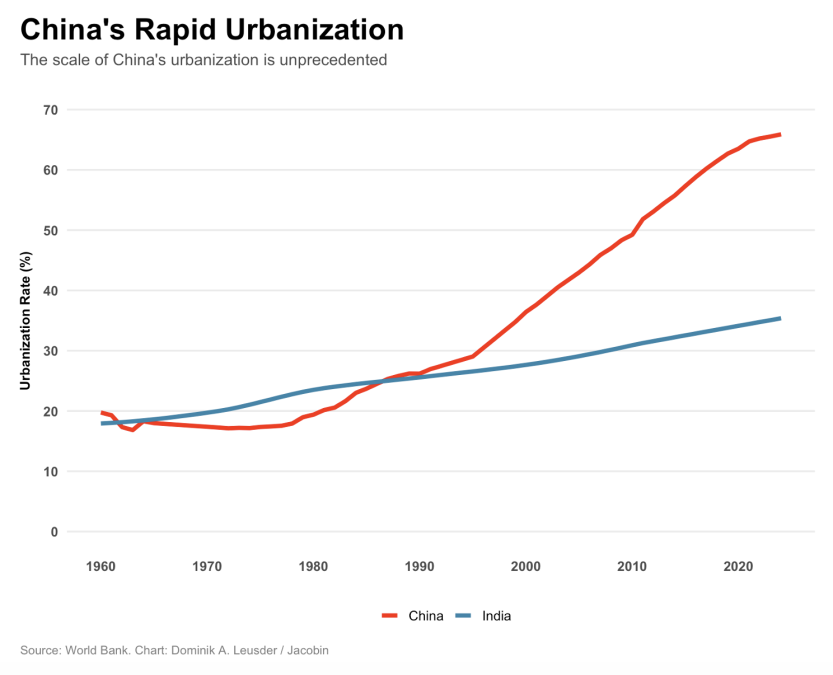 By contrast, China’s urbanization is arguably the single most dramatic process of material and social transformation of the postwar era. Over the course of three decades, around half a billion people migrated into new cities, where 90 percent of all currently inhabited housing was built since the 1980s. This process also accounted for most of the country’s carbon emissions, with one estimate attributing 74 percent of the growth in household consumption–related emissions to urbanization. The grand infrastructure projects and material culture of these cities have become a source of envy.