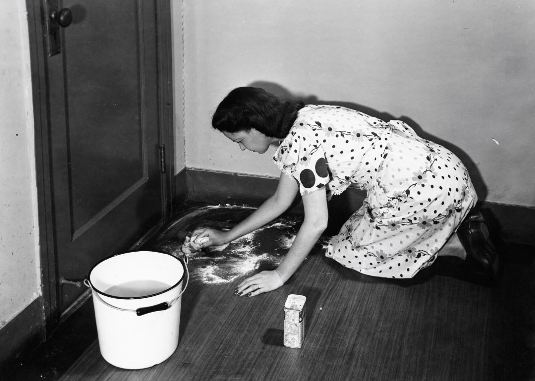 A young woman on all fours with a tin of cleaning powder, circa 1955. (James W. Welgos / Archive Photos via Getty Images)