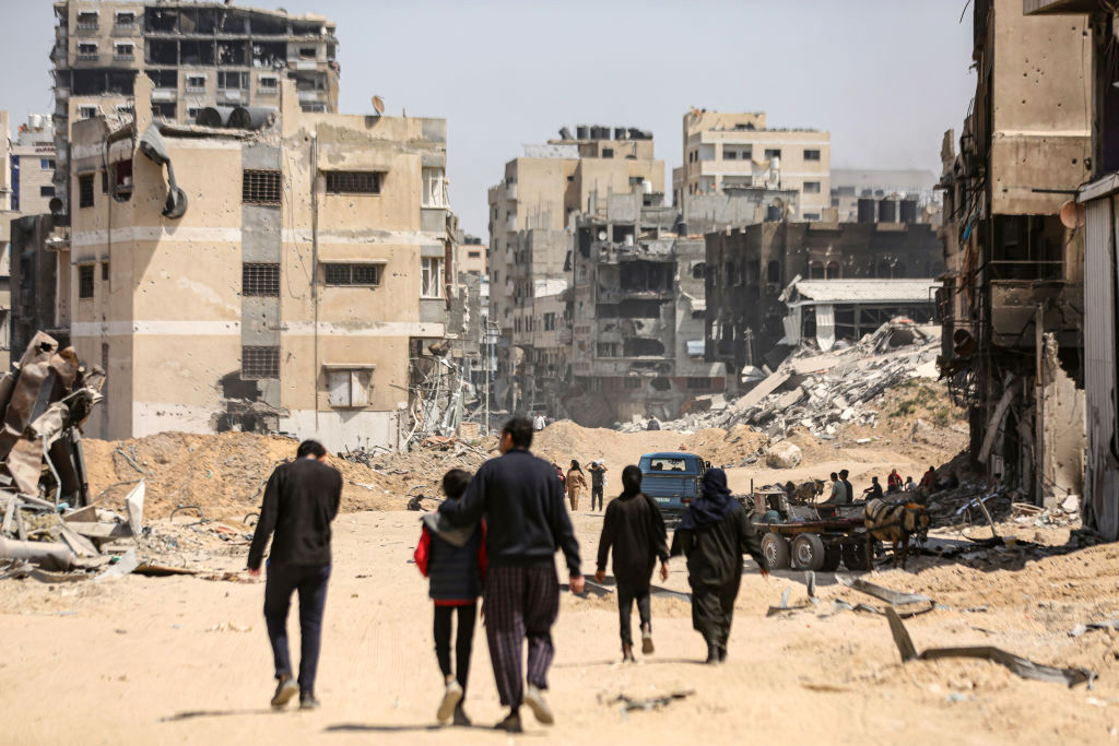 Gazans walk among extensive destruction in the vicinity of al-Shifa Hospital in the neighborhood of al-Rimal, Gaza, on April 2, 2024. (Dawoud Abo Alkas / Anadolu via Getty Images)