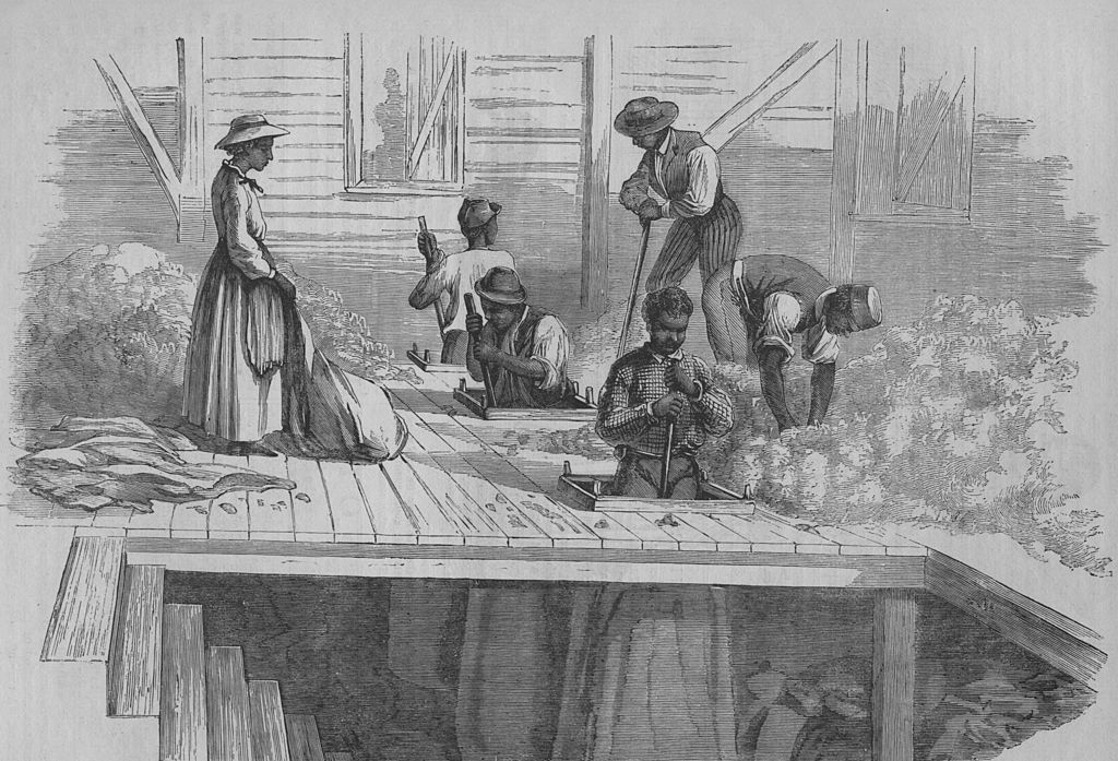 Illustration of African-American slaves working on a cotton plantation circa 1840. Kean Collection / Getty