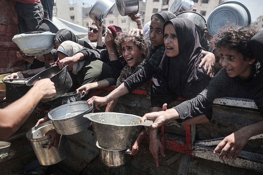 Palestinians line up in Gaza City, Gaza, to receive food on August 2, 2025. (Abdalhkem Abu Riash / Anadolu via Getty Images)