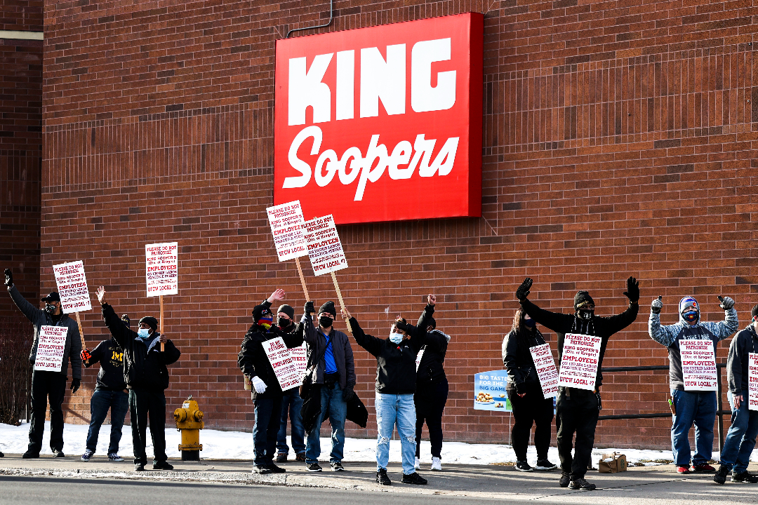 King Soopers grocery store workers wave at passing cars as they strike at more than seventy stores across the Denver metro area on January 12, 2022, in Denver, Colorado. King Soopers workers are now set to strike the chain across the state beginning February 6. (Michael Ciaglo / Getty Images)