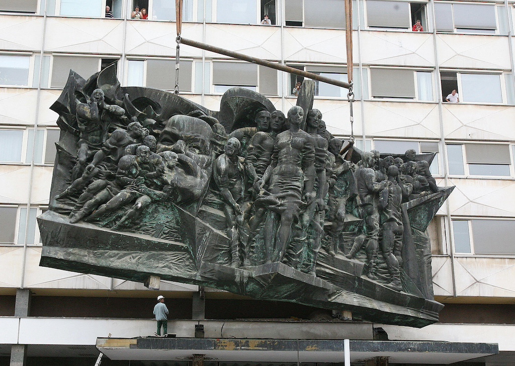 Cranes lift away a 33-ton statue of Karl Marx at the entrance of University of Leipzig, eastern Germany. (Sebastian Willnow / DDP / AFP via Getty Images)