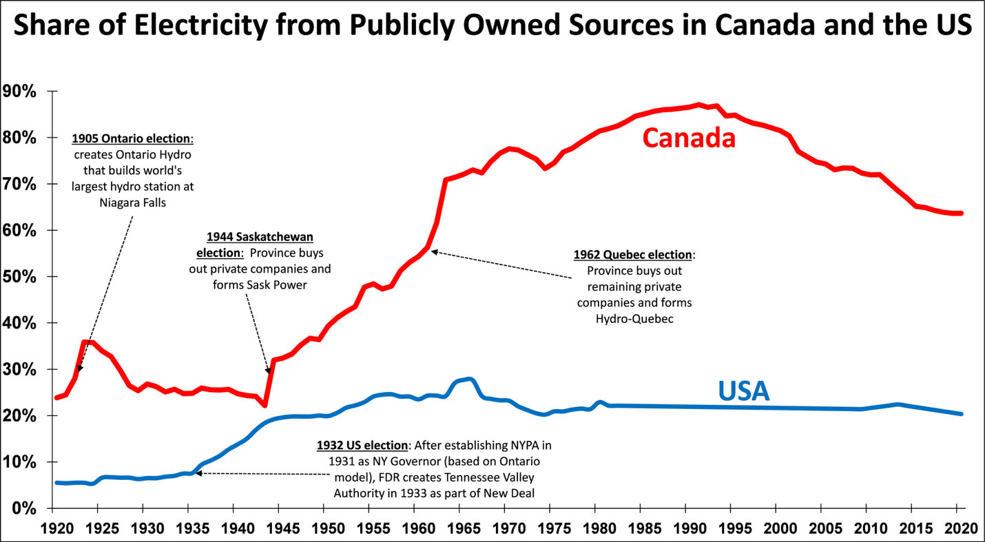 Public ownership of electricity was once a signature achievement of Canadian progressivism. Visionaries like Adam Beck in Ontario, Tommy Douglas in Saskatchewan, and René Lévesque in Quebec ensured Canadians had access to cheap, abundant, publicly provided power. This model, unlike the US system dominated by private utilities, or the UK’s post-Thatcher privatizations, delivered high union density and stable, well-paying jobs for generations of Canadian workers.