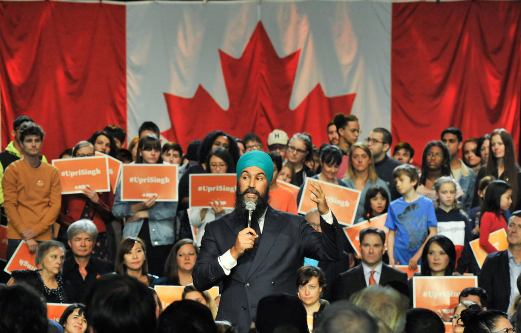 NDP leader Jagmeet Singh addresses supporters in Vancouver, BC, 2019. (Don Mackinnon / AFP via Getty Images)