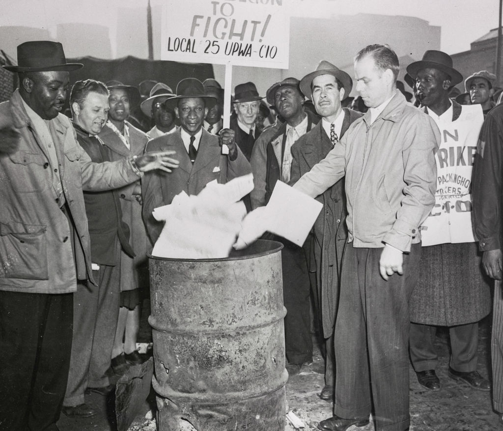 United Packinghouse Workers of America strikers burn company letters threatening loss of jobs, May 4, 1948. (Bettmann / Getty Images)