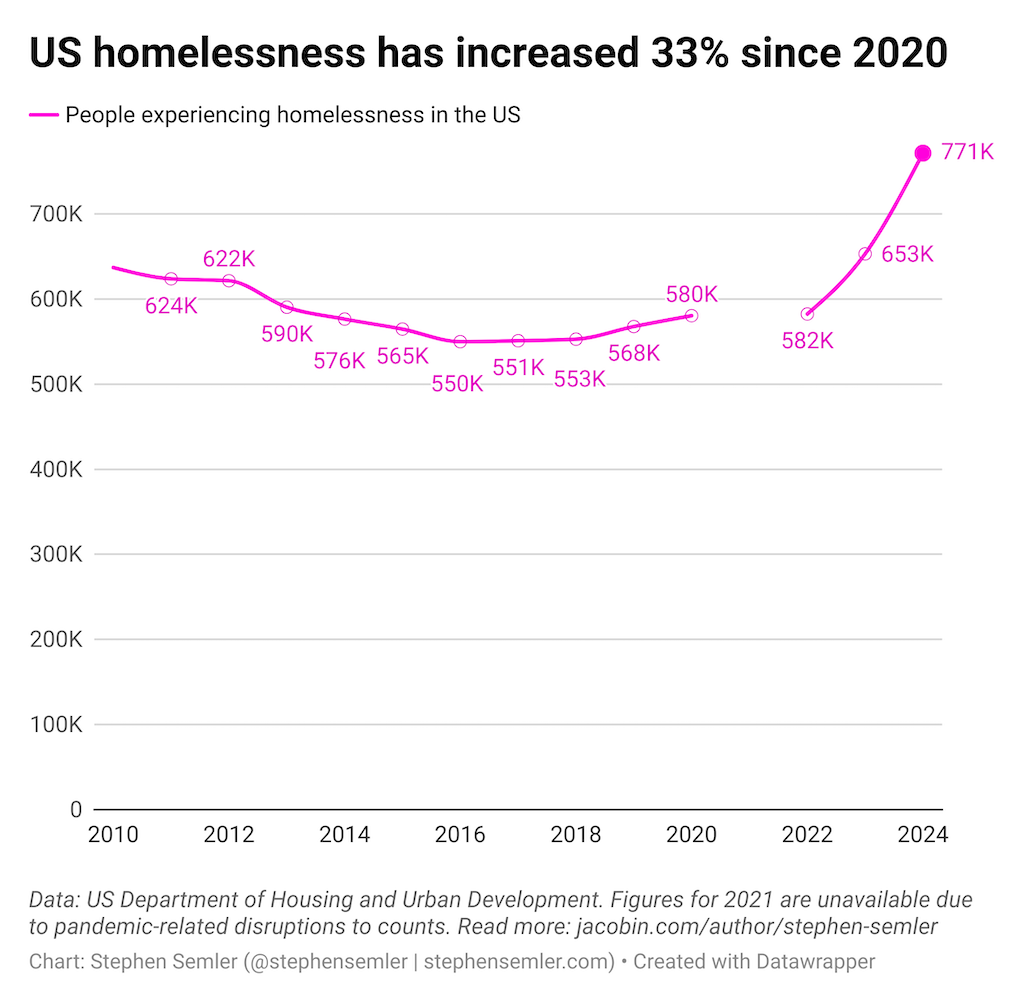 Homelessness in the United States is now at a record high, according to a new report from the Department of Housing and Urban Development (HUD). The data show that 771,480 people were homeless in 2024 — 18 percent more than in 2023 and a staggering 33 percent jump since 2020. Even in a country that has normalized rampant homelessness, this isn’t normal.