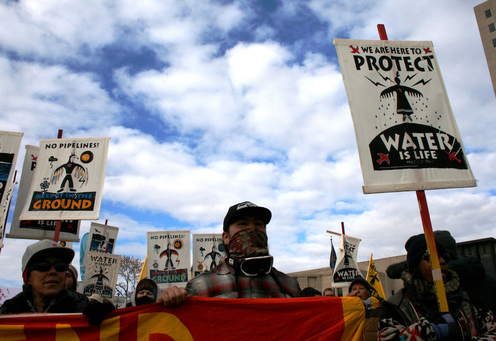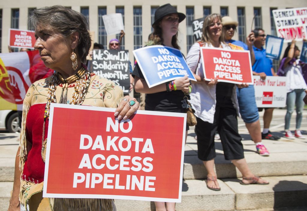 Protesters hold a rally with the Standing Rock Sioux tribe in support of a lawsuit against the Army Corps of Engineers and plans for the Dakota Access Pipeline outside the US District Court in Washington, DC, August 24, 2016. (Saul Loeb / AFP via Getty Images)