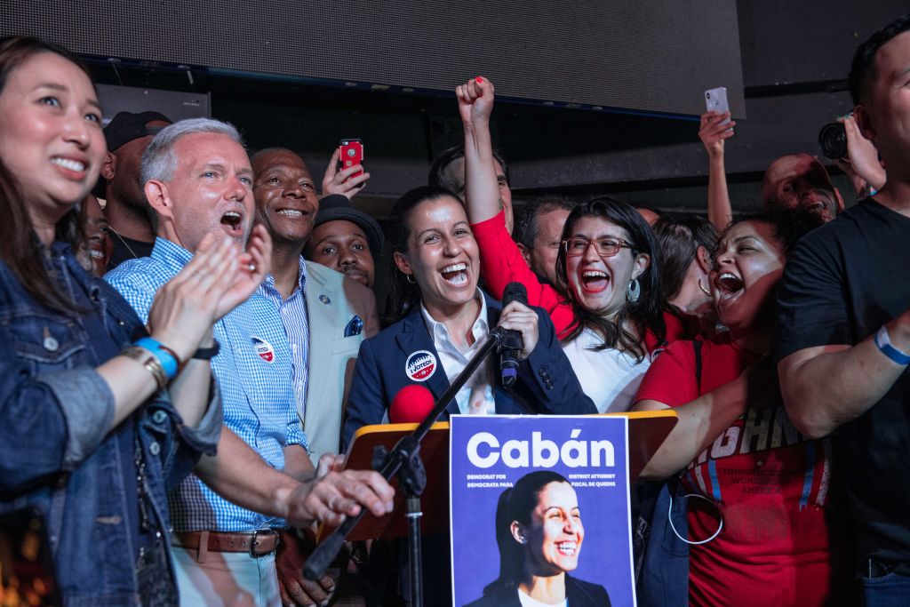 Public defender Tiffany Cabán celebrates her victory with supporters after the Democratic primary for Queens district attorney on June 25, 2019. (Scott Heins / Getty Images)