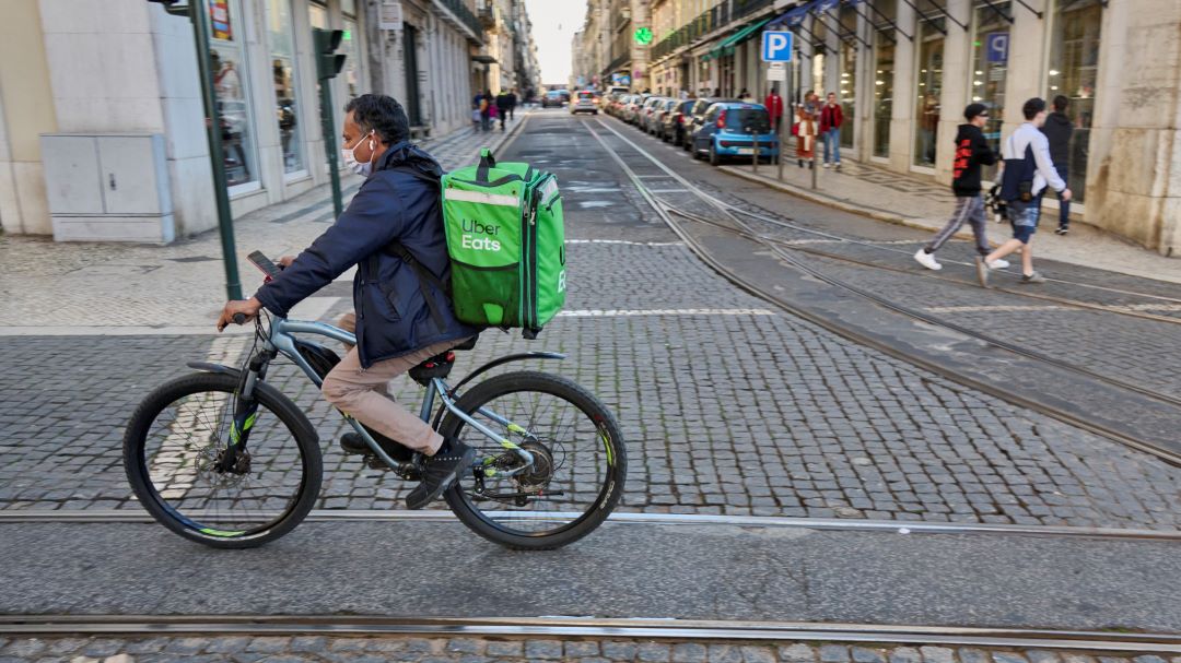 A mask-clad Uber Eats delivery driver rides a bicycle on January 22, 2022 in Lisbon, Portugal. (Horacio Villalobos / Corbis via Getty Images)