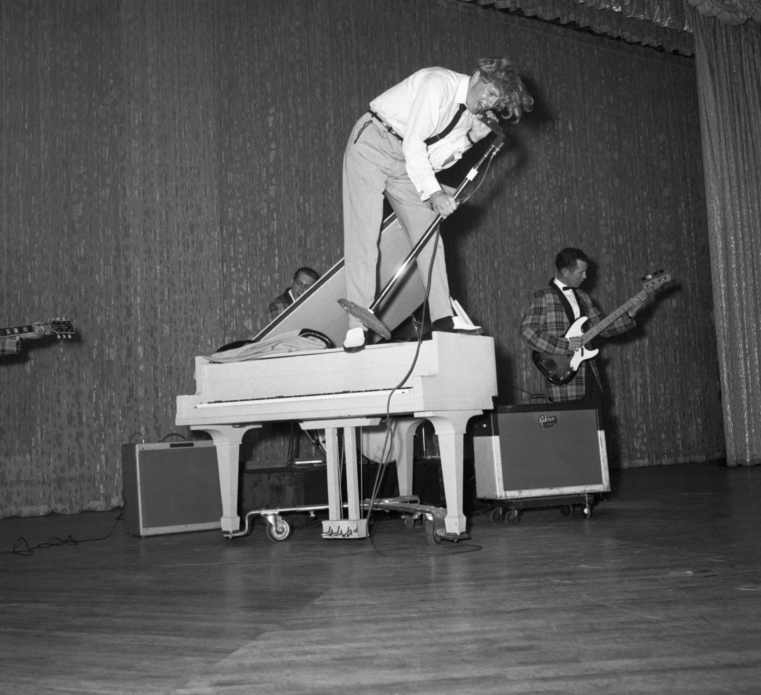 Standing atop a piano, rock 'n' roll singer Jerry Lee Lewis gives an enthusiastic performance at the Cafe de Paris in New York City on June 10, 1958. (Bettmann / Getty Images)