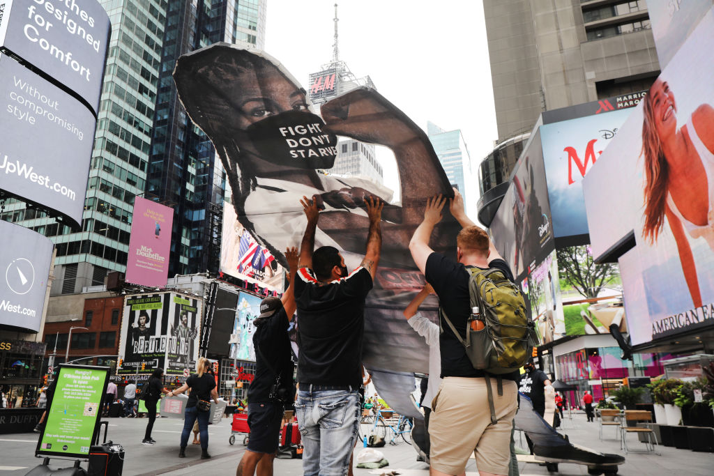 With a twenty-four-foot wooden statue of "Elena the Essential Worker," activists from One Fair Wage hold a demonstration in Times Square to demand a fair wage for tipped workers during coronavirus and beyond, on August 31, 2020 in New York City. (Spencer Platt / Getty Images)