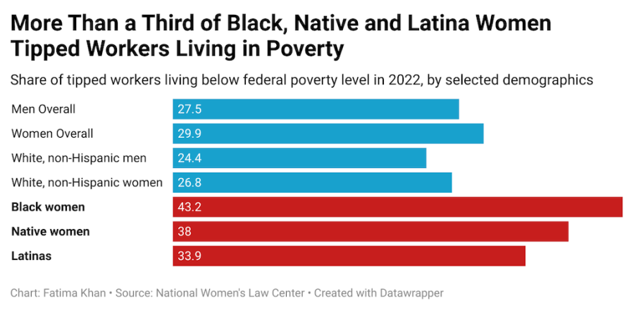 Women make nearly 70 percent of all tipped employees, and women of color are among those most heavily affected by the subminimum wage. Black, Native American, and Latina women who work for tips are disproportionately likely to live in poverty.