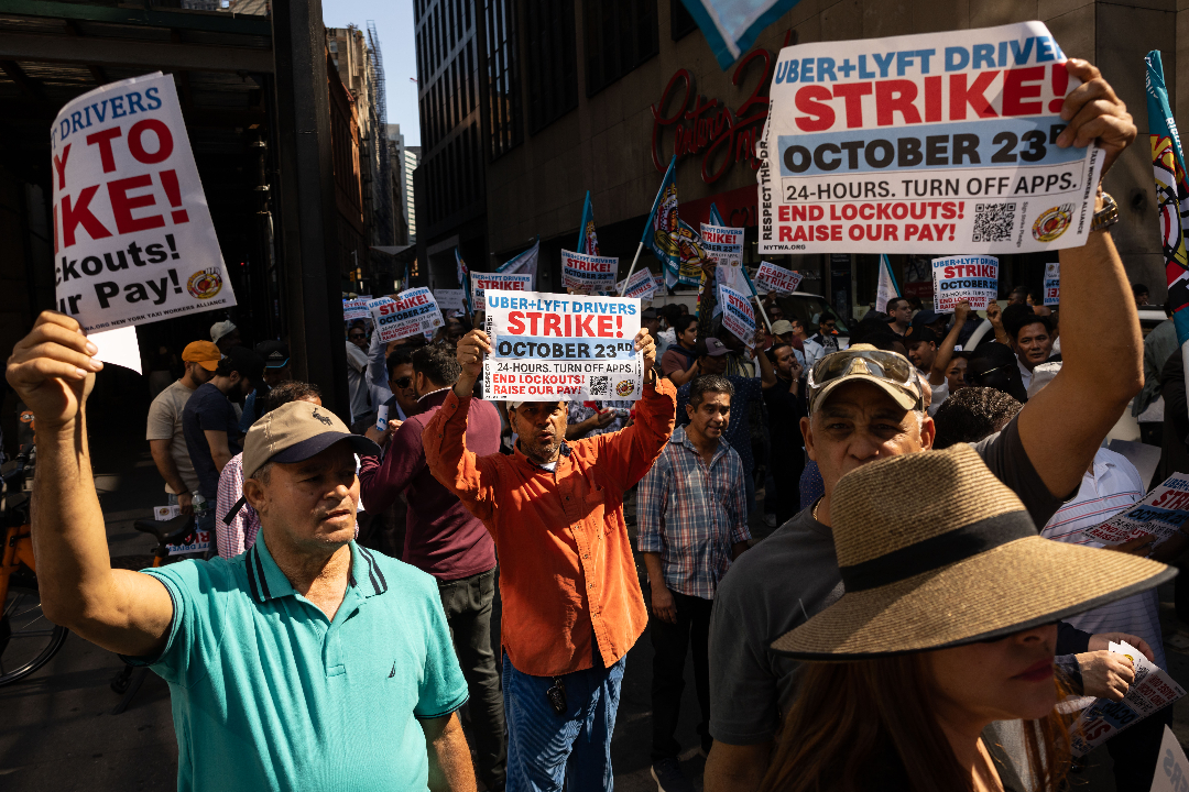 Uber and Lyft drivers protest outside the Uber office in New York on Wednesday, September 4, 2024, over the rideshare companies intentionally locking workers out of the apps. (Yuki Iwamura / Bloomberg via Getty Images)