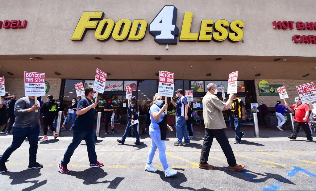 Grocery store workers represented by the United Food and Commercial Workers hold a boycott rally in front of a Food4Less Supermarket in Los Angeles, California, on May 12, 2021. (Photo by Frederic J. Brown / AFP via Getty Images)