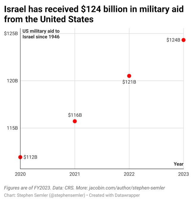 Weapons, munitions, and other matériel make up nearly 80 percent of the US assistance sent to Israel since 1946. Through September 2023, the United States has given the country more than $124 billion in military aid.