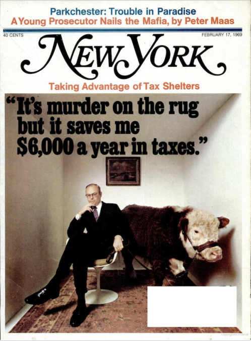 By the end of the decade, reports on loopholes benefitting the rich were commonplace in newspapers and magazines, a trend exemplified by a provocative February 1969 New York magazine cover story on the use of tax loss farming schemes by everyone from celebrities to Wall Street execs.