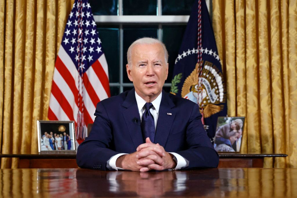 Joe Biden addresses the nation on the conflict between Israel and Gaza and the Russian invasion of Ukraine from the Oval Office of the White House in Washington, DC, on October 19, 2023. (Jonathan Ernst / POOL / AFP via Getty Images)