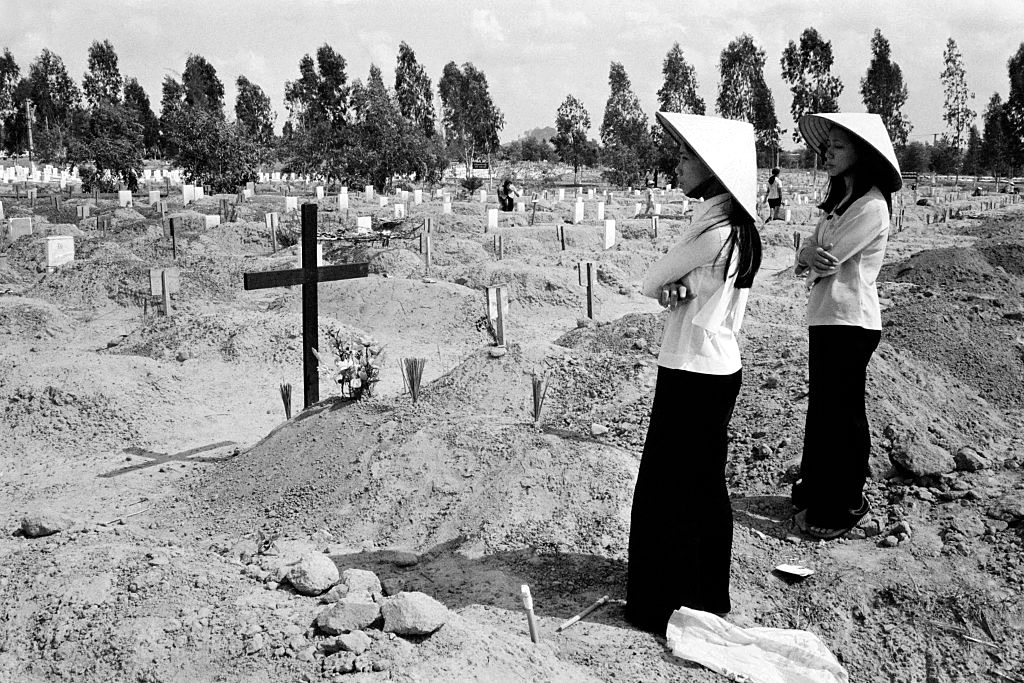 Two Vietnamese women mourn their relatives on April 29, 1975, at Bien Hoa military cemetery as the US started to evacuate their embassy in Saigon. (Françoise Demulder / AFP via Getty Images)