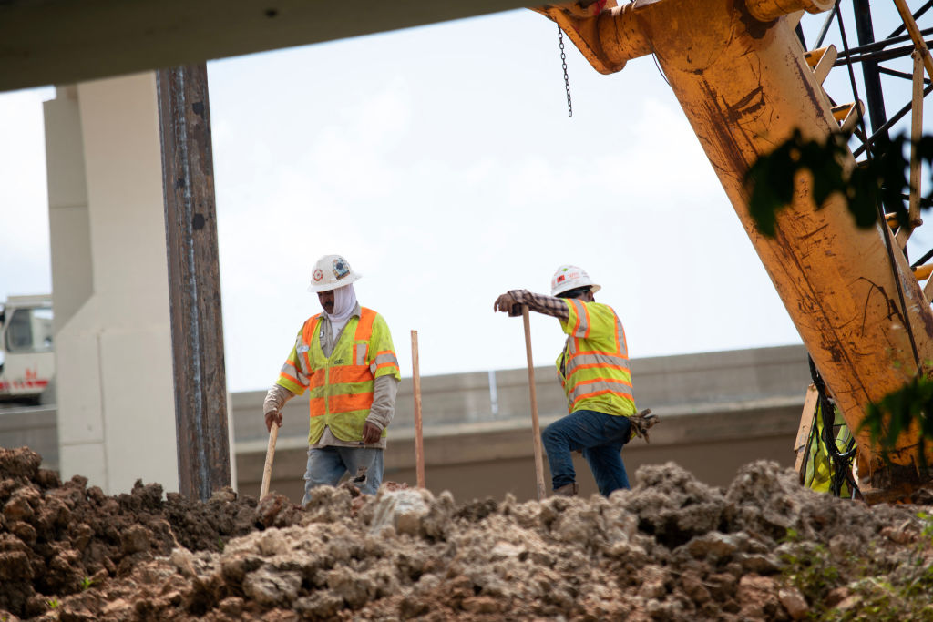 Construction workers rebuild the I-69 Southwest/I-610 West Loop Interchange during a heat wave in Houston, Texas, on July 14, 2023. (Photo by Mark Felix / AFP via Getty Images)
